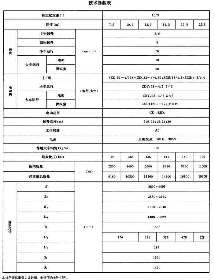 起升吨位: 5、10/3、16/3、20/5、32/10吨