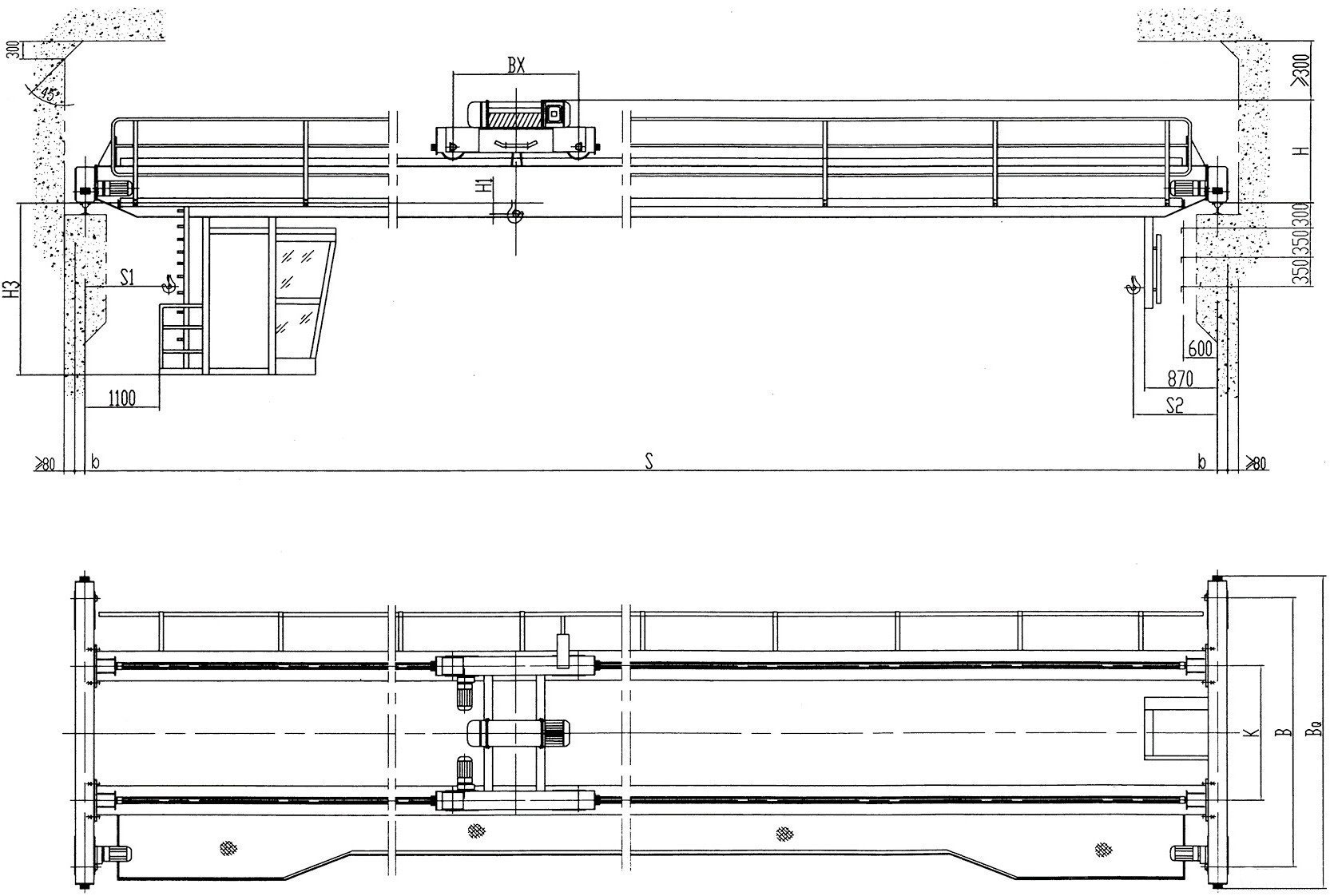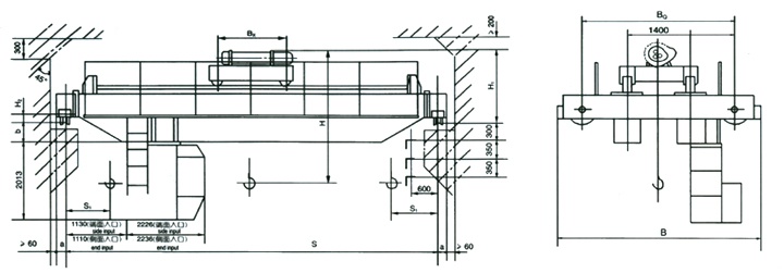 LH型葫芦双设有司机室操纵和地面操纵两种形式。操作室有开式、闭式两种,可根据实际情况分为左或者右面安装两种形式。入门方向有侧面、端面、顶部三种,以满足用户在不同需要的情况下进行选择。